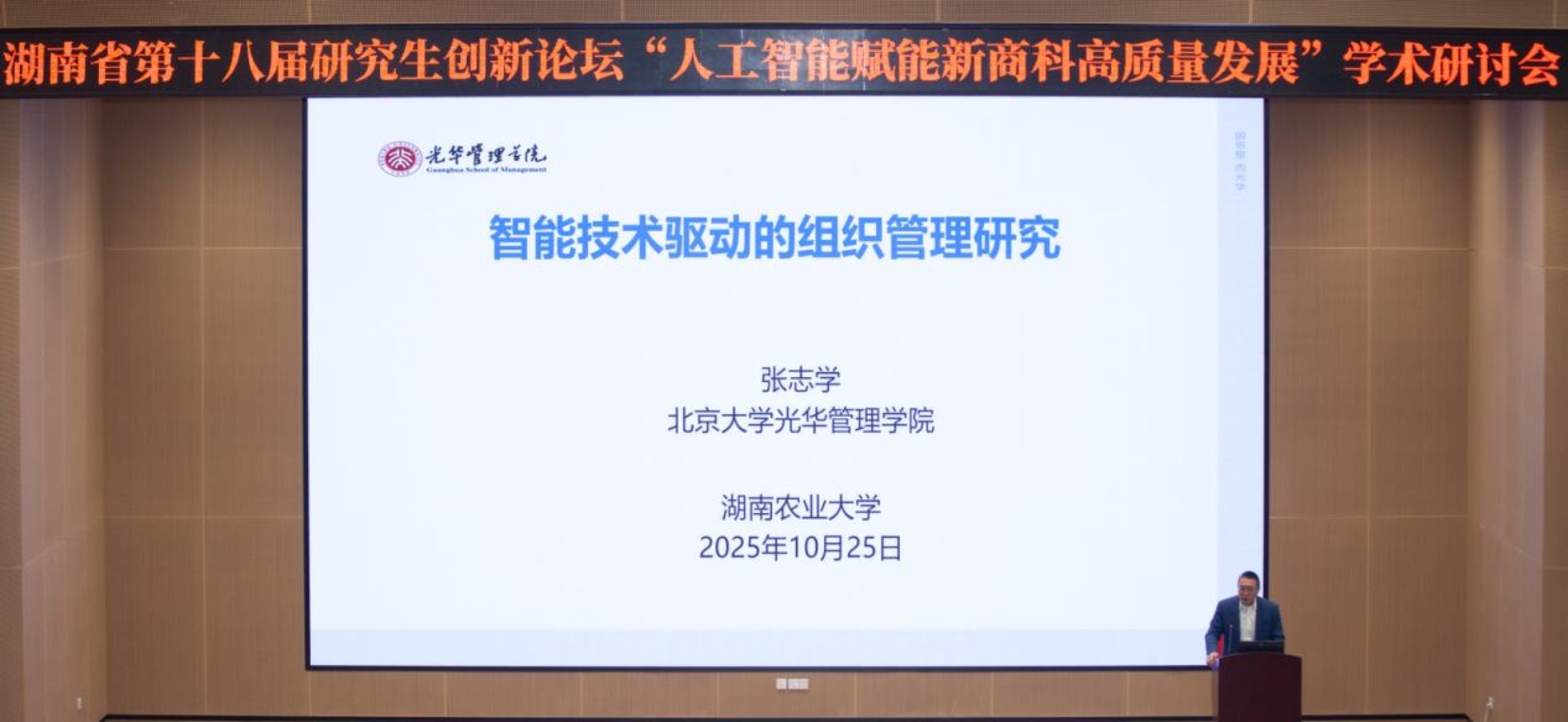 本网讯(商学院 李文涛 左声亮)10月25日,湖南省第十八届研究生创新论坛“人工智能赋能新商科高质量发展”学术研讨会在湖南农业大学岳麓山实验室4号楼102会议厅隆重举行。本次论坛由湖南省人民政府学位委员会、湖南省教育厅、湖南农业大学主办,湖南农业大学研究生院、湖南农业大学商学院、湖南农业大学社会科学处、中国企业管理研究会农业企业管理专业委员会联合承办。会议由湖南农业大学商学院党委书记莫华主持。来自北京大学、浙江财经大学、浙江工业大学、中南大学、湖南大学等省内外高校和科研院所的300余名师生齐聚一堂,共同围绕“人工智能实践与新商科教育创新、数智时代新商科专业重塑与人才培养”等前沿议题展开研讨。