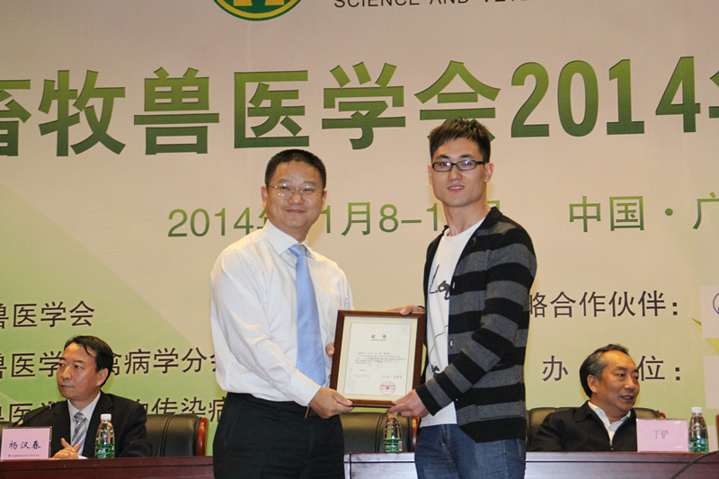 本次会议以“预防控制疫病,保障畜禽生产”为主题,邀请157名国内外知名专家、学者、青年科技工作者,紧紧围绕“猪病”、“禽病”及“其他动物病”防控作了精彩的的学术报告,其中有13位院士、知名专家做了大会报告。我院12级临床兽医博士呼高伟作了题为《一种包含PRRSV结构蛋白GP5抗原表位的嵌合VLPS构建与分析》学术报告,并做了现场交流。年会期间,经过评审专家评审,颁发了中国畜牧兽医学会奖——优秀论文奖10名,优秀论文提名奖23名,我院呼高伟博士获得了优秀论文奖。 在接受采访时,呼高伟师兄诚恳地说,感谢导师杨毅教授对他辛勤培养,严格的要求和训练,及实验室其他老师指导,同时也离不开同学的帮助。在谈到如何有效度过研究生阶段的学习时,呼高伟师兄指出,研究生首先要有一个明确的目标,多与导师和同学交流,向师兄师姐学习实验技术,早点进实验室。课后,多跟同一领域不同专业的同学交流学习,最后再加上自己后天的努力,相信每个同学都有一定的收获。在科技论文撰写方面,呼高伟师兄建议我们要多阅读相关文献,平时要多积累语言素材。