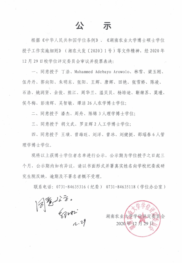 湖南农业大学2020年12月博士、硕士学位授予决议