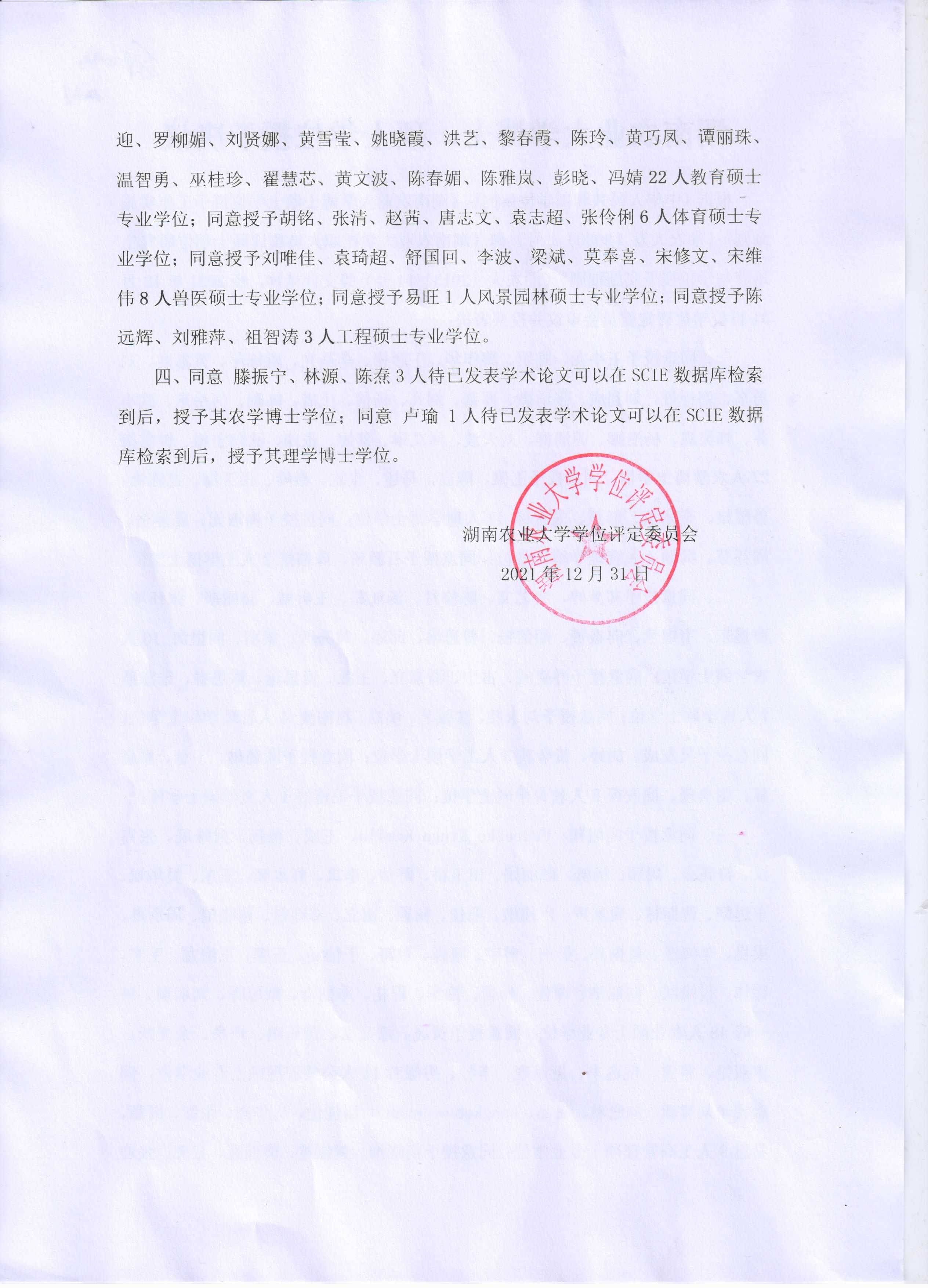 2021年12月湖南农业大学博士、硕士学位授予决议