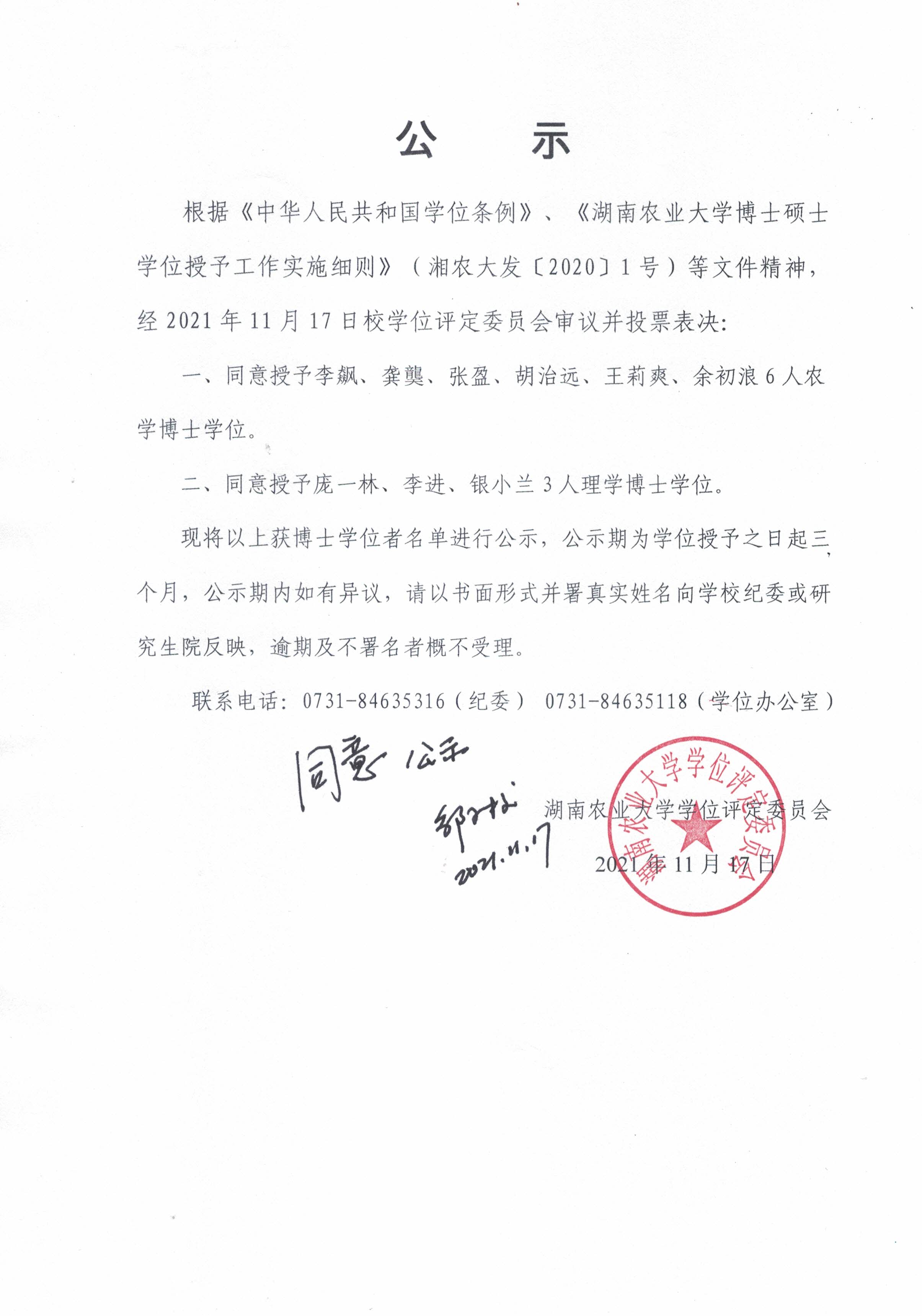 湖南农业大学2021年11月博士、硕士学位授予决议
