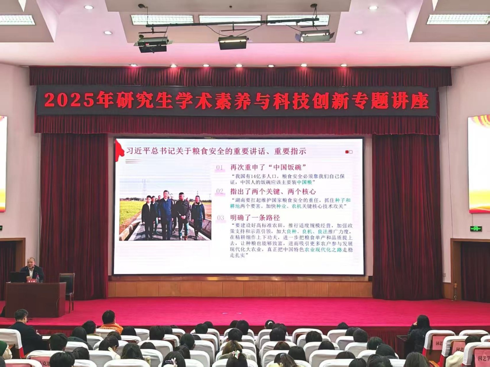 本网讯(研究生工作部 范颖平)12月5日,学校特邀湖南省发展和改革委员会党组成员,湖南省粮食和物资储备局党组书记、局长夏文斌为我校研究生带来一场题为《牢记殷殷嘱托,扛稳粮食安全重任》的专题学术讲座。讲座聚焦粮食安全这一“国之大者”,紧密结合湖南实际,进行了系统深入的阐述,吸引了众多师生到场聆听。